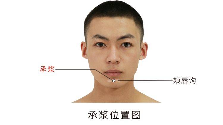 承浆,别称下唇、天池、鬼市、悬浆,出自《甲乙经》中。位于面部,颏唇沟的正中凹陷处,在口轮匝肌和颏唇沟之间;有下唇动、静脉分支;布有面神经的下颌及颏神经分支。主治口歪、齿龈肿痛、流涎等口部病证;暴喑;癫狂。操作方法为斜刺0.3-0.5寸。