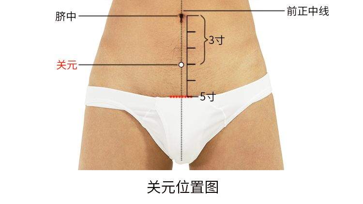 关元,经穴名。出自《素问·气穴论》。别名三结交、下纪、次门、丹田、大中极。属任脉。位于下腹部,脐中下3寸,前正中线上。在腹白线上,有腹壁浅动、静脉分支和腹壁下动、静脉分支,布有第12肋间神经前皮支的内侧支,深部为小肠。主治中风脱症、虚痨冷惫、羸瘦无力、少腹疼痛、疝气、腹泻、痢疾、脱肛、便血、五淋、尿血、尿闭、尿频、遗精、阳痿、早泄、白浊、月经不调、痛经、闭经、崩漏、带下、阴挺、恶露不尽、胞衣不下等。直刺1-1.5寸。