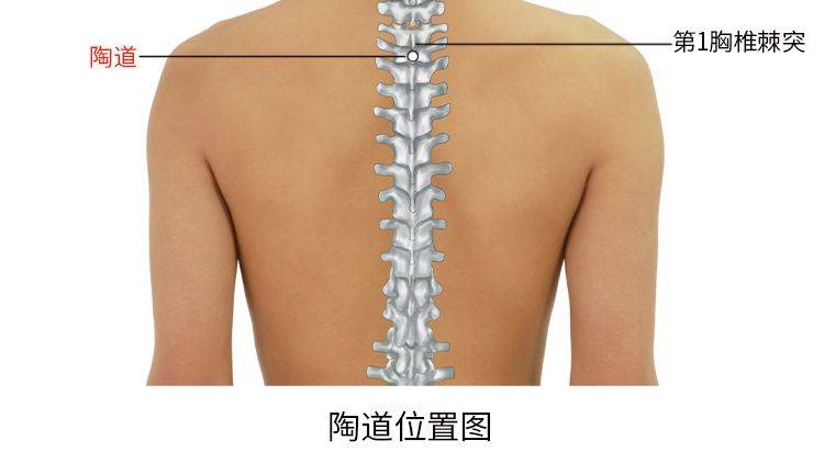 陶道,经穴名。出自《针灸甲乙经》。属督脉。位于脊柱区,第1胸椎棘突下凹陷中,后正中线上。在腰背筋膜、棘上韧带及棘间韧带中,有第1肋间动脉后支和棘间皮下静脉丛,布有第1胸神经后支的内侧支,深部为脊髓。主治热病、疟疾、恶寒发热、咳嗽、气喘、骨蒸潮热、癫狂、脊强。向上斜刺0.5-1寸。