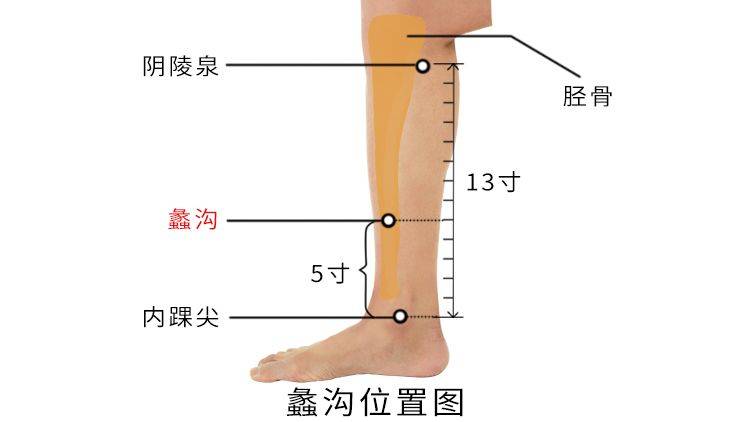 简便定位:位于小腿胫侧,内踝上缘上5寸,胫骨内侧面的中央,胫骨后缘取之,左右计2穴。