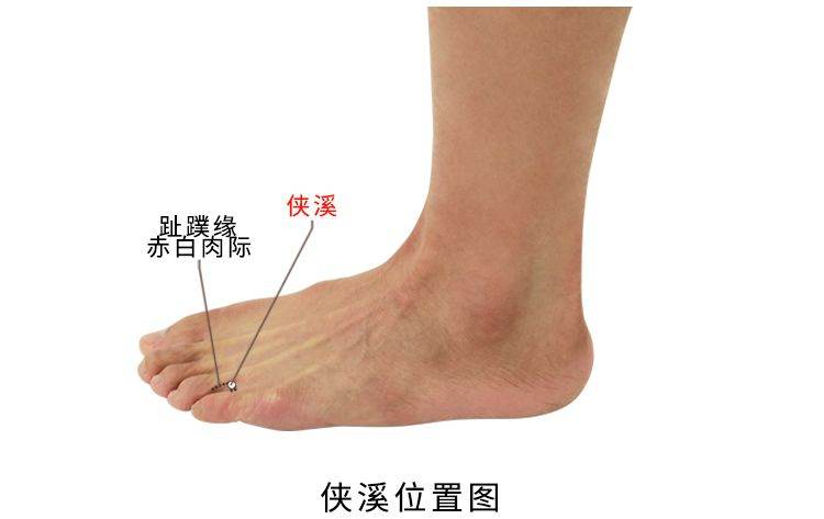 侠溪,经穴名。出自《灵枢·本输》。属足少阳胆经。荥(水)穴。在足背部,第四、五趾缝间,趾蹼缘后方赤白肉际处。布有趾背神经和趾背动、静脉。主治胁肋痛,寒热,头痛,目眩,耳鸣,耳聋,目外眦痛,颊颔肿,足背肿痛,足趾痉挛,及高血压,乳腺炎等。斜刺0.3-0.5寸。艾炷灸3壮;或艾条灸5-10分钟。