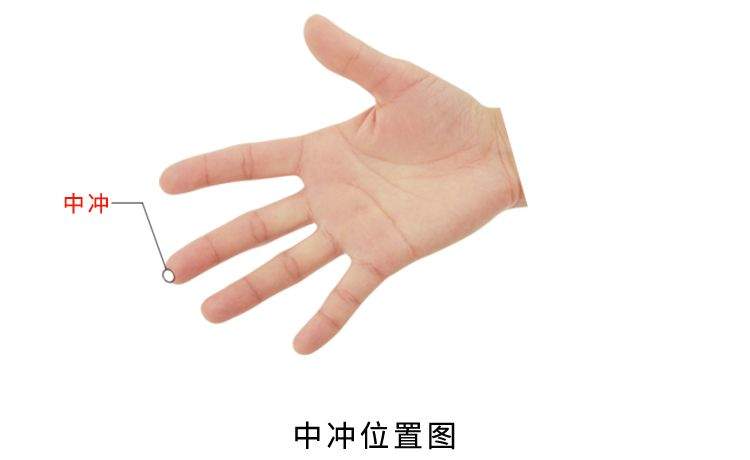 中冲,经穴名。出自《灵枢·本输》。别名手心主。属手厥阴心包经。位于手指,中指末端最高点。有指掌侧固有动、静脉所形成的动、静脉网,为正中神经的指掌侧固有神经分布处。主治中风昏迷、舌强不语、中暑、昏厥、小儿惊风、热病、舌下肿痛、小儿夜啼。浅刺0.1寸,或点刺出血。