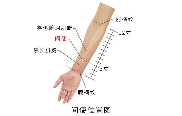 间使,经穴名。出自《灵枢·本输》。别名鬼路。属手厥阴心包经。位于前臂前区,腕掌侧远端横纹上3寸,掌长肌腱与桡侧腕屈肌腱之间。在桡侧腕屈肌腱与掌长肌腱之间,有指浅屈肌,深部为指深屈肌,有前臂正中动、静脉,深部为前臂掌侧骨间动、静脉,布有前臂内侧皮神经,其下为正中神经,深层有前臂掌侧骨间神经。主治心痛、心悸、胃痛、呕吐、热病、疟疾、癫狂痫、腋肿、肘/臂/腕挛痛。直刺0.5-1寸。