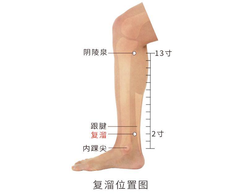 复溜,经穴名。出自《灵枢·本输》。别名伏白、昌阳、外命。属足少阴肾经。位于小腿内侧,内踝尖上2寸,跟腱的前缘。在比目鱼肌下端移行于跟腱处的内侧,前方有胫后动、静脉,布有腓肠内侧皮神经、小腿内侧皮神经,深层为胫神经。主治水肿、汗证(无汗或多汗)、腹胀、腹泻、肠鸣、腰脊强痛、下肢痿痹。直刺0.5-1寸。