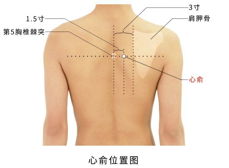 心俞穴,经穴名。出自《针灸甲乙经》。属足太阳膀胱经。位于第5胸椎棘突下,旁开1.5寸。有斜方肌、菱形肌,深层为最长肌,有第5、第5肋间动、静脉后支,布有第5、第6胸神经后支的皮支,深层为第5、第6胸神经后支外侧支。主治心痛、惊悸、失眠、健忘、癫痫、咳嗽、吐血。斜刺0.5-0.8寸。