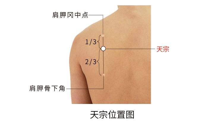 天宗,经穴名。出自《针灸甲乙经》。属手太阳小肠经。位于肩胛区,肩胛冈中点与肩胛骨下角连线上1/3与下2/3交点凹陷中。在冈下窝中央冈下肌中,有旋肩胛动、静脉肌支,布有肩胛神经。主治肩胛疼痛、肩背部损伤、气喘。直刺或斜刺0.5-1寸。