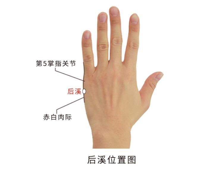 后,指第五掌指关节后方。穴在第五掌指关节后方,握拳时,当尺侧横纹头处,其形犹如沟溪,故名后溪。