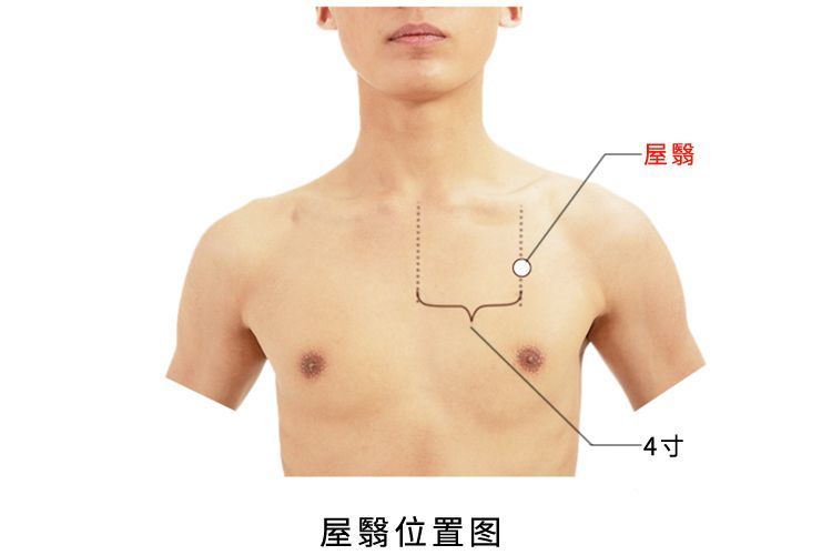 屋翳,经穴名。出自《针灸甲乙经》。属足阳明胃经。位于胸部,第2肋间隙,前正中线旁开4寸。有胸大肌、胸小肌,深层为肋间内、外肌,有胸肩峰动、静脉分支,布有胸前神经分支。主治咳嗽、气喘、咳唾脓血、胸胁胀痛、乳痈、乳癖等。斜刺或平刺0.5-0.8寸。