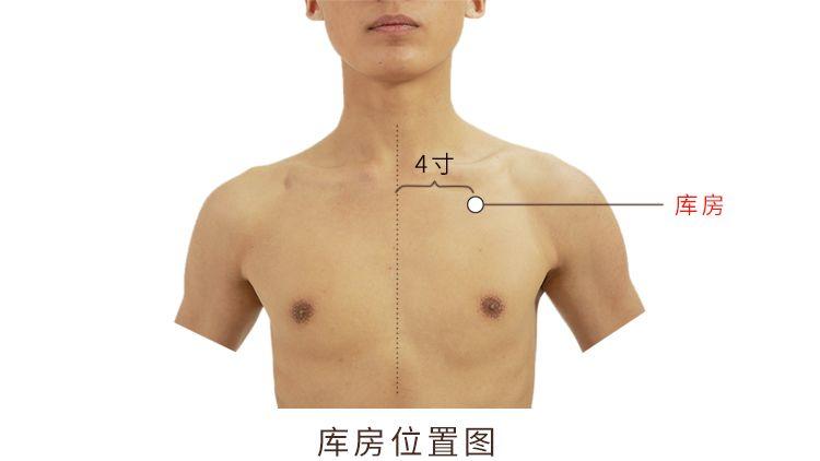 库房,经穴名。出自《针灸甲乙经》。属足阳明胃经。位于胸部,当第1肋间隙,距前正中线4寸。有胸大肌、胸小肌,深层为肋间内、外肌,有胸肩峰动、静脉及胸外侧动、静脉分支,布有胸前神经分支。主治咳嗽、气喘、胸胁胀痛、咳吐脓血等。斜刺或平刺0.5-0.8寸,不宜深刺。