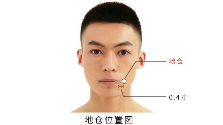 地仓,经穴名。出自《针灸甲乙经》。别名会维、胃维。属足阳明胃经。位于面部,口角旁开0.4寸(指寸)。在口轮匝肌中,深层为颊肌,有面动、静脉,布有面神经和眶下神经分支,深层为颊神经的末支。主治口角歪斜、流涎、面痛、齿痛等局部病证。斜刺或平刺0.5-0.8寸。