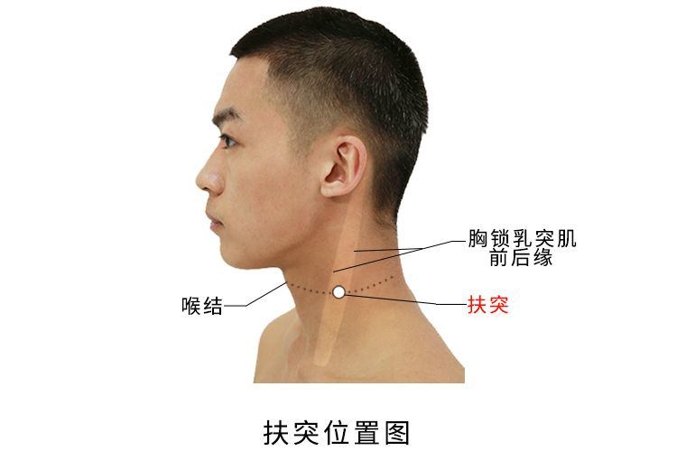 扶突,经穴名。出自《灵枢·本输》。别名水穴。属手阳明大肠经。位于胸锁乳突肌区,横平喉结,胸锁乳突肌前、后缘中间。在胸锁乳突肌、颈阔肌中,深层为肩胛提肌起始点,深层内侧有颈升动脉,布有耳大神经、颈皮神经、枕小神经及副神经。主治咽喉肿痛、暴喑、吞咽困难、瘿气、瘰疬、呃逆、咳嗽、气喘。为颈部手术针麻用穴。直刺0.5-0.8寸。