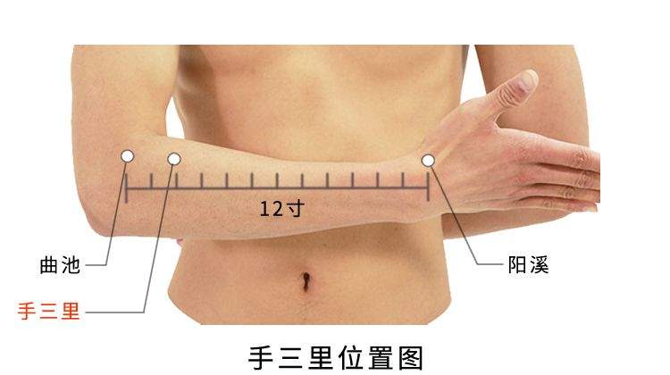 手三里,经穴名。出自《针灸甲乙经》。属手阳明大肠经。位于前臂,肘横纹下2寸,阳溪与曲池连线上。肌肉、神经同上廉穴,血管为桡返动脉的分支。主治手臂无力、上肢不遂、腹痛、腹泻、齿痛、颊肿。直刺1-1.5寸。