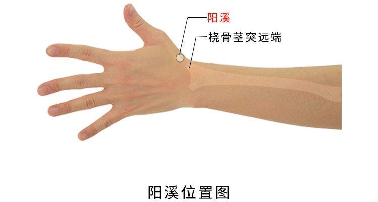 阳溪,经穴名。出自《灵枢·本输》。别名中魁。属手阳明大肠经。位于腕区,腕背侧远端横纹桡侧,桡骨茎突远端,解剖学“鼻烟窝”凹陷中。当拇短伸肌腱、拇长伸肌腱之间,有头静脉,桡动脉本干及其腕背支,布有桡神经浅支。主治头痛、目赤肿痛、耳聋、手腕痛。直刺或斜刺0.5-0.8寸。