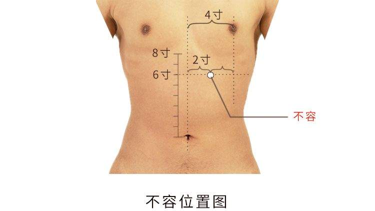 不容,胃经的气血物质本穴不为容纳也。本穴位处乳之下部,所受气血乃胃经上部区域脾土中的外渗水液,至本穴后因无外界之热使其气化转变,其运行只是单纯的循经下传,故名不容。