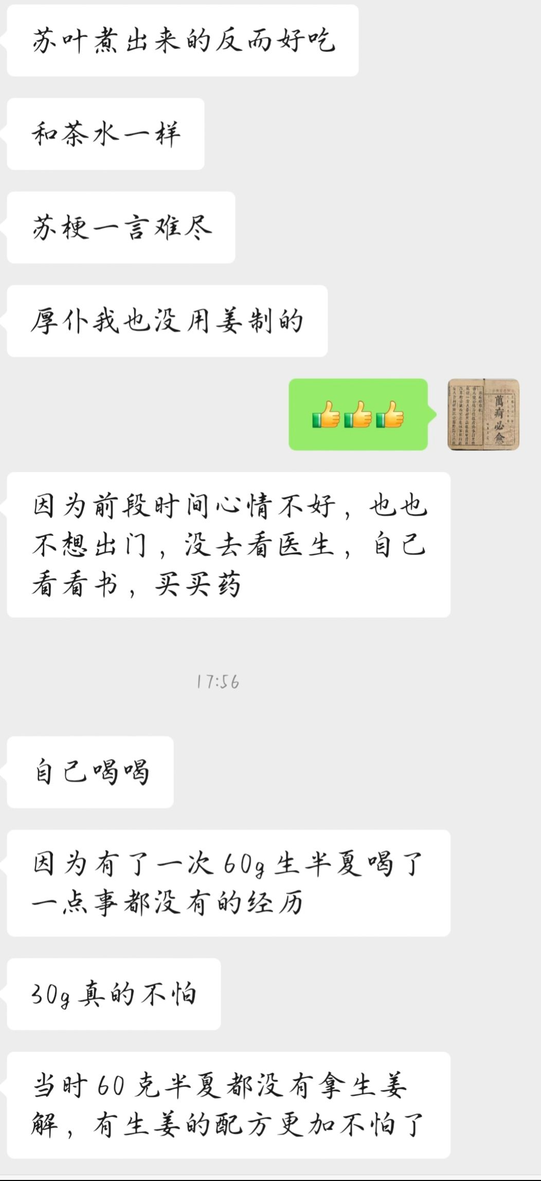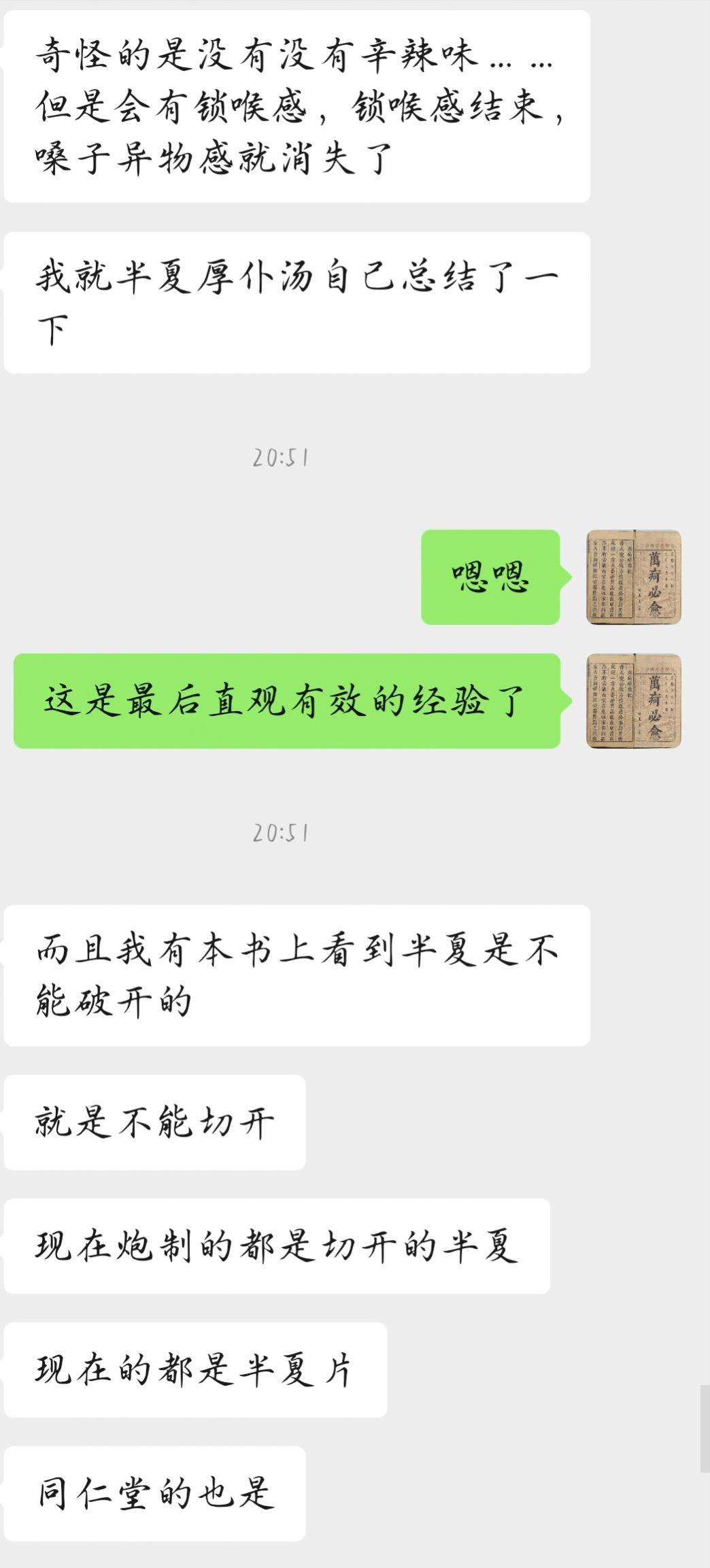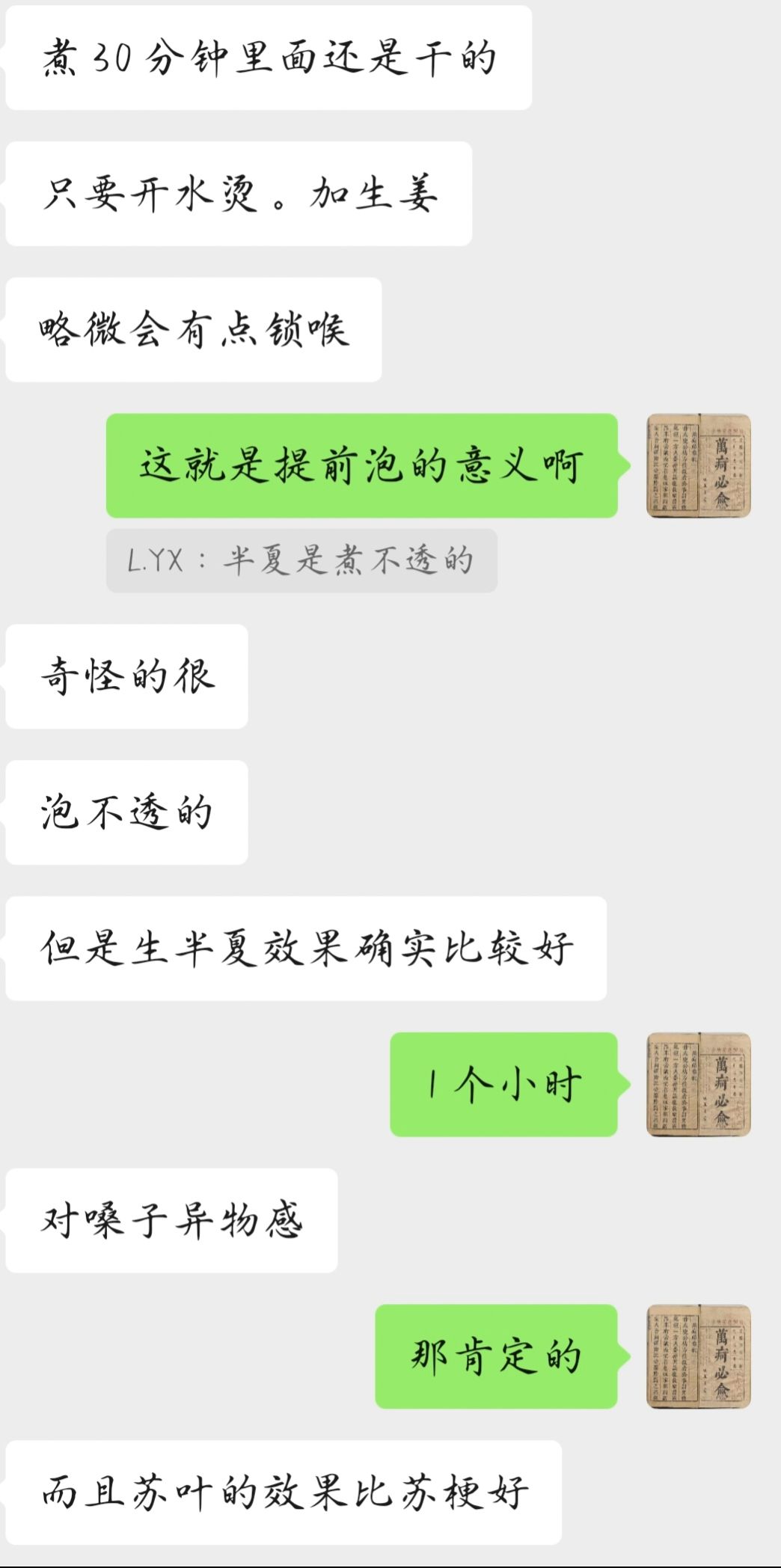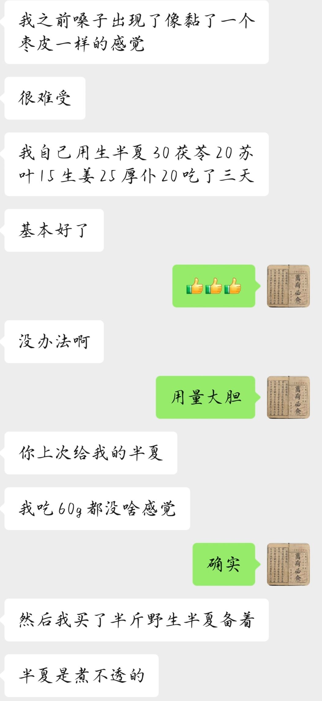 有几个问题我啰嗦几句,1是他说的半夏煮半个小时还煮不透,很多药就是会这样,尤其是淀粉含量比较大的、比较干的,就是会外面直接熟了,水进入不到里面,导致里面一直是干心的,所以方子里有成块的、大个的含淀粉量多的药物时,一定要先泡够1个小时2是半夏的毒性问题,我一直认为半夏是没有什么毒性的,它的毒性来自于它体表的黏液,就像山药的黏液会让人痒一样,半夏的黏液“戟人咽喉”,不洗干净黏液就煮,药液会刺激咽喉,可导致喉头水肿,影响呼吸,这是致命的,但是洗干净之后,一般没有什么问题,就像我之前曾给他开60g生半夏,他服用之后没啥事一样。3生半夏有毒,不建议个人擅自大剂量、超剂量服用。